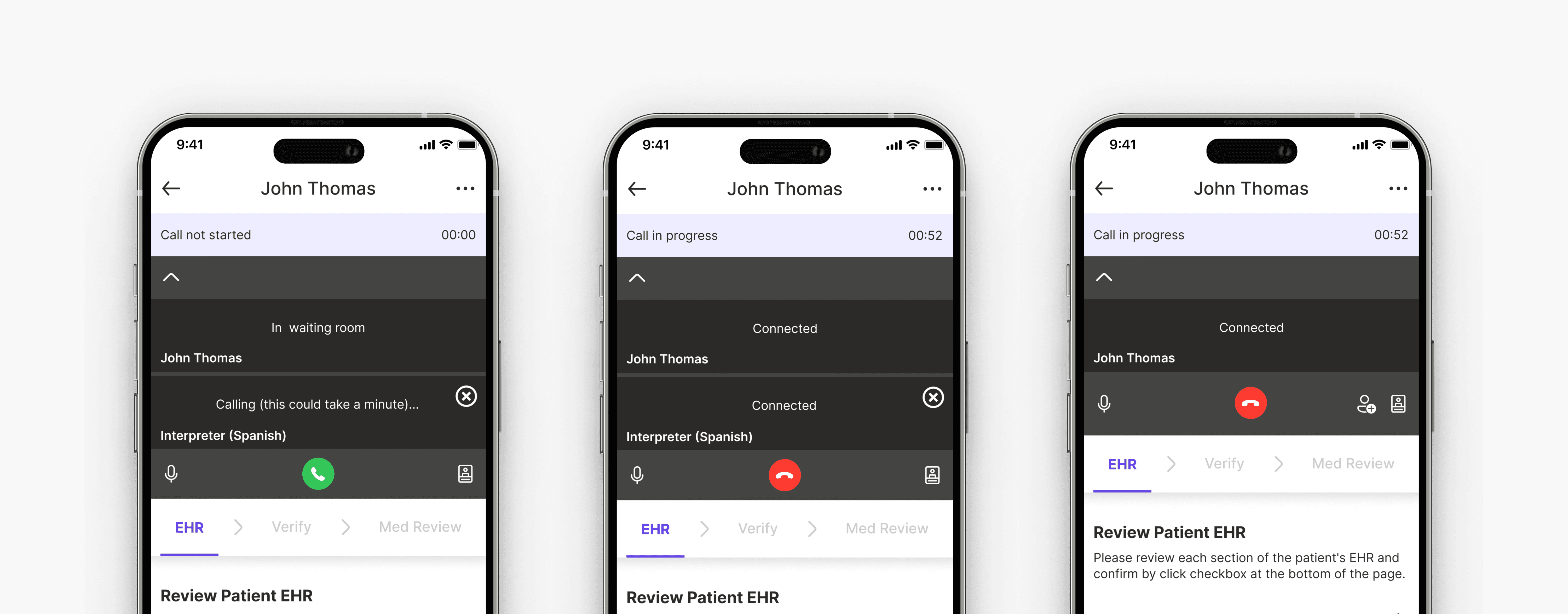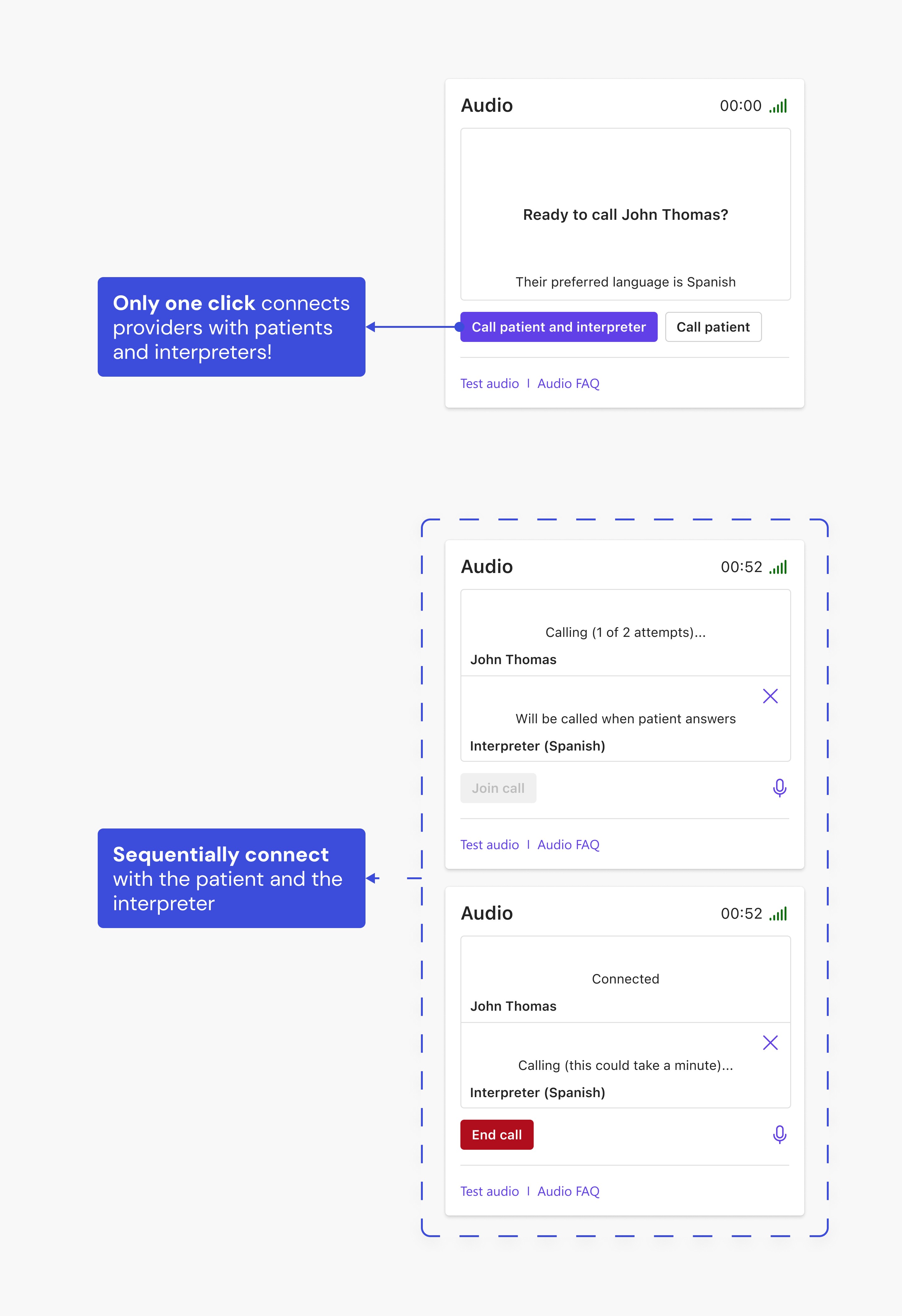 One click to initiate the call, sequentially connecting with the patient and the interpreter