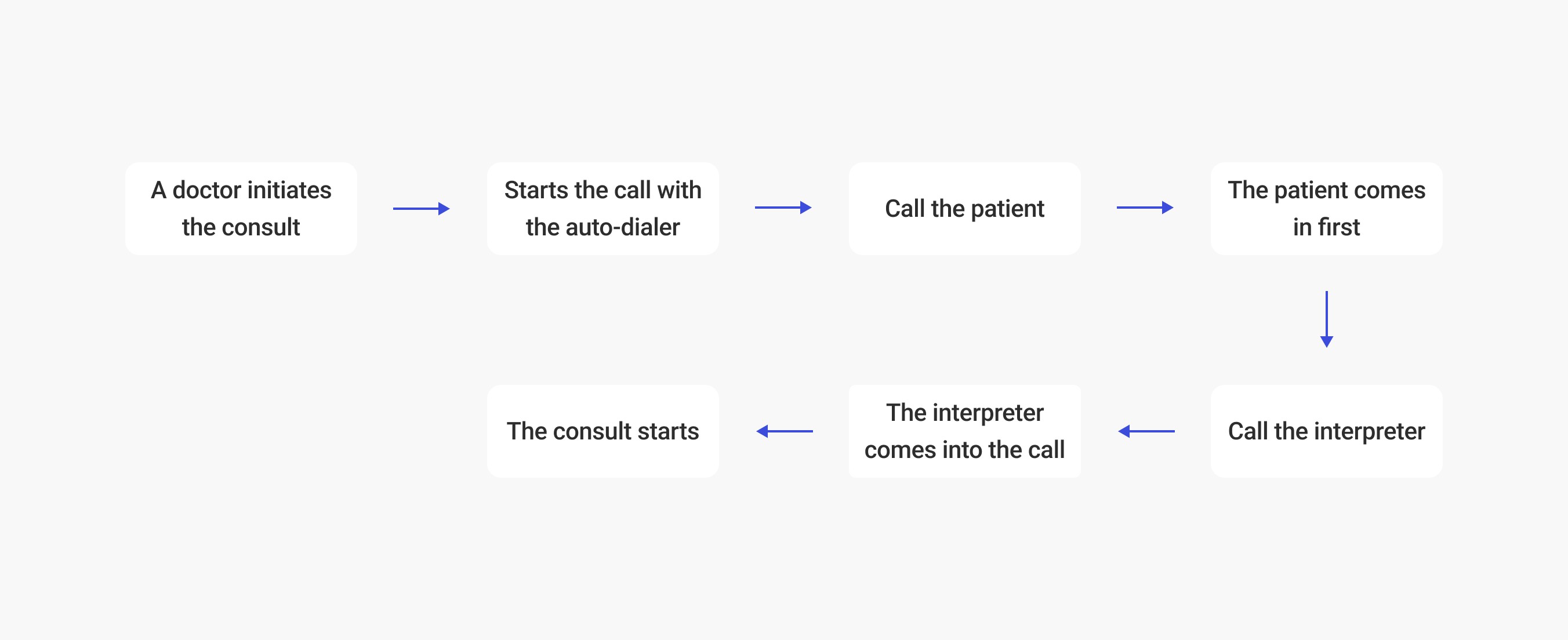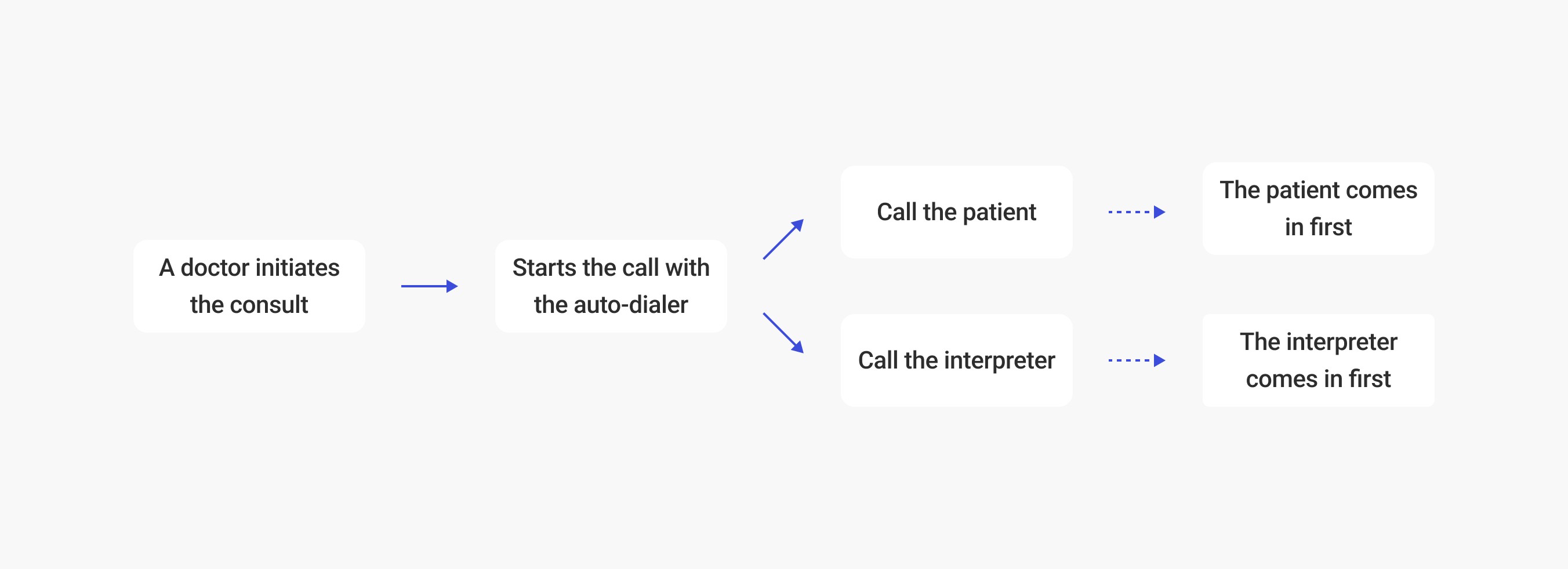 We interviewed doctors about the call initiation flow, which has become more complex and time-consuming with the addition of interpreters. This has increased doctor dissatisfaction due to the extra effort required without additional compensation, potentially affecting management.